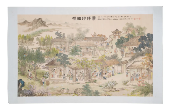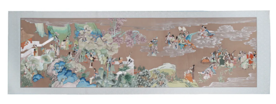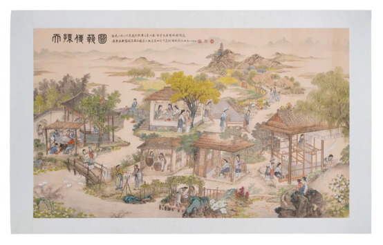 此次捐贈為《嫘祖遺澤圖》《天孫傳藝圖》真跡及《群仙祝壽圖》真絲手繡等四件珍貴藏品,其中《嫘祖遺澤圖》和《天孫傳藝圖》為絹本畫,作者為著名畫家丁慶齡先生、王柳影先生和黃子曦先生,作品取材自南北朝時期有關(guān)黃帝正妻嫘祖西陵氏被尊奉為蠶神“先蠶”的傳說和天孫娘娘,即織女傳授人間絲綢製造技術(shù)的傳說。兩幅著作以精湛的畫技和對中國傳統(tǒng)養(yǎng)蠶繅絲技藝、織造技藝的精通,生動展現(xiàn)了古代養(yǎng)蠶、繅絲、紡織的全過程,具有極高的歷史與藝術(shù)價值。
