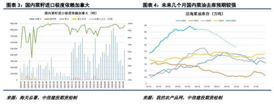 6月10日即將實(shí)施的保稅區(qū)監(jiān)管新規(guī)引發(fā)近期企業(yè)洗船,根據(jù)我們的了解, 6月后國內(nèi)菜籽到港僅剩零星幾條。在此背景下,即便中加關(guān)系能在后期獲得實(shí)質(zhì)性改善,在2025/26年度加菜籽新作上市供應(yīng)前,我們預(yù)計國內(nèi)菜籽供應(yīng)也較難獲得明顯改善。加菜籽新作在8-9月收割后,運(yùn)到中國并通關(guān)壓榨,至少也得到10月。在當(dāng)前俄羅斯菜油也已進(jìn)入出口季末的情況下,未來幾個月國內(nèi)菜油去庫的傾向依然較強(qiáng)。隨著菜油市場擔(dān)憂情緒釋放,這預(yù)計將逐步對菜油期價帶來支撐,關(guān)注菜油09合約在9000附近的支撐表現(xiàn)。