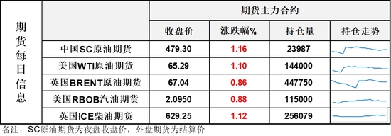 【1】WTI主力原油期貨收漲0.71美元,漲幅1.1%,報(bào)65.29美元/桶;布倫特主力原油期貨收漲0.57美元,漲幅0.86%,報(bào)67.04美元/桶;INE原油期貨收漲1.16%,報(bào)479.3元。