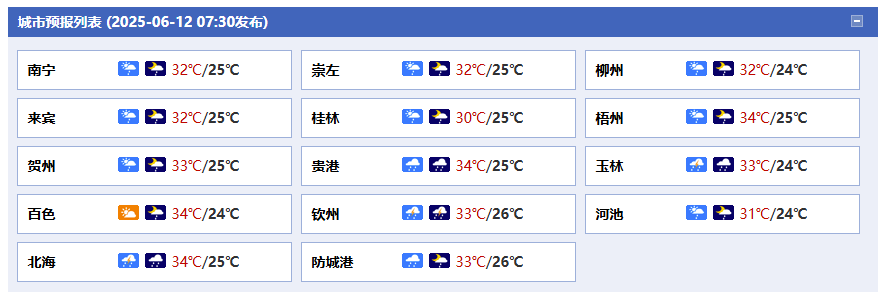 南寧市:今天白天到晚上,多云有陣雨或雷雨、局地大雨,東北風2級,最高氣溫32℃,最低氣溫26℃。