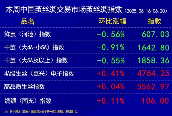 受傳統(tǒng)淡季影響,中低等級與高品質(zhì)生絲本周在整體走貨節(jié)奏放緩。不過,生絲價格指數(shù)仍在上周基礎上實現(xiàn)小幅震蕩略收紅。