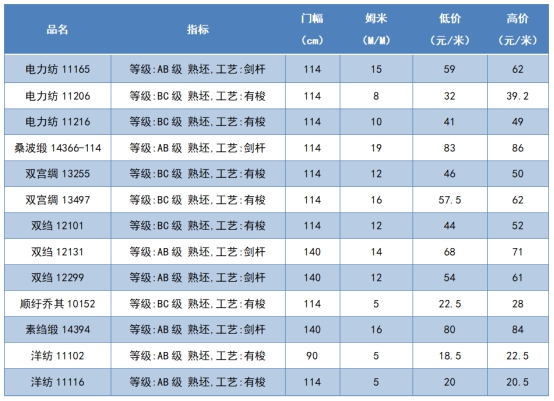 本周綢緞指數(shù)協(xié)作單位成交價格區(qū)間