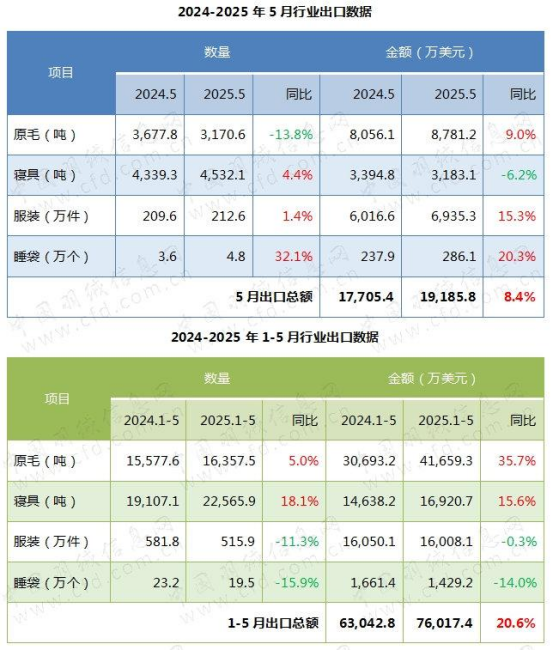 2025年5月,我國(guó)羽絨行業(yè)出口總額約1.9億美元,同比上漲8.4%,增速環(huán)比4月明顯下滑。分產(chǎn)品看,原毛出口量下降13.8%,但出口額卻增長(zhǎng)9.0%,出口平均單價(jià)有所提高,同比增長(zhǎng)26.4%。寢具出口平均單價(jià)下滑,出口量增長(zhǎng)4.4%,但出口額下降了6.2%。服裝出口繼續(xù)恢復(fù),出口量值分別增長(zhǎng)1.4%和15.3%。