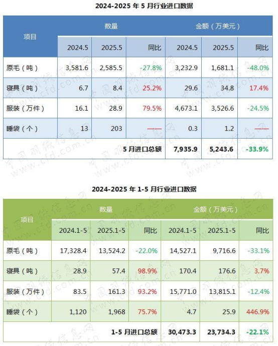 1-5月,行業(yè)進(jìn)口總額2.4億美元,同比下降22.1%,環(huán)比1-4月降幅擴(kuò)大4.1個(gè)百分點(diǎn)。其中,原毛進(jìn)口額同比下降33.1%;服裝進(jìn)口數(shù)量雖然增長(zhǎng)明顯,漲幅達(dá)93.2%,但進(jìn)口金額卻減少了12.4%。