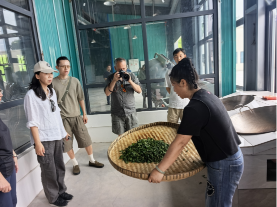 在非遺炒茶工坊,新鮮采摘的桑葉需在2-5小時(shí)內(nèi)完成萎凋工序,賡續(xù)完成殺青工序。非遺傳承人在高溫?zé)犸L(fēng)設(shè)備蒸騰的霧靄中,以炒茶鍋為舞臺(tái),配合“三殺三揉+低溫烘焙”傳統(tǒng)工藝為大家呈現(xiàn)了一場(chǎng)優(yōu)雅的指尖茶韻“交響曲”,清香逐步沉淀,轉(zhuǎn)為醇厚的焦香和回甜,泡制的茶葉其“清雅甘醇”的口感也引得探訪團(tuán)隊(duì)頻頻點(diǎn)贊。而中國桑都文化展示館內(nèi),從近代桑蠶畫像到現(xiàn)代桑枝菌培育技術(shù)的演變歷程,全景呈現(xiàn)了樂至“千年蠶桑之鄉(xiāng)”的文化厚度。