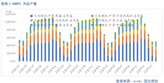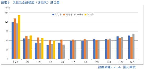ANRPC 最新發(fā)布2025年5月報告預測,2025年全球天膠產(chǎn)量料同比增加0.5%至1489.2萬噸,較4月份的預測值基本一致。其中,泰國增1.2%、印尼降9.8%、中國增6%、印度增5.6%、越南降1.3%、馬來西亞降4.2%、柬埔寨增5.6%、緬甸增5.3%、其他國家增3.5%。5月份由于泰國割膠面臨推遲,導致供應端低于去年同期,不過6月份泰國開割局面打開,再加上隨著近幾年膠價的持續(xù)上漲,整體利潤尚可,因此膠農(nóng)割膠意愿抬升。所以綜合來看,而下半年面臨全球天膠市場的增產(chǎn)季和高產(chǎn)季,今年以來天氣擾動偏低,若后續(xù)天氣擾動影響較小,天膠產(chǎn)量將存在季節(jié)性上漲預期中,壓力不容忽視。