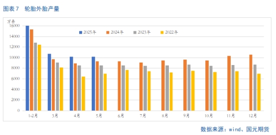 從下游市場來看,在今年全球經(jīng)濟萎縮、美國關稅政策以及地緣沖突的影下,國內(nèi)輪胎的產(chǎn)量增速低于去年同期。據(jù)統(tǒng)計,1-5月份我國輪胎的產(chǎn)量達到4.89億條較上年同期增長2.8%,遠低于去年同期9.5%的增速。但是由于今年上半年國內(nèi)輪胎市場處于搶出口,因此導致2025年前5個月,我國輪胎出口量達到389萬噸,同比增長7.3%,遠高于去年的4.6%的增速。