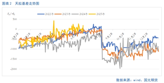 2025年上半年天然橡膠市場重心呈現(xiàn)了明顯的回落,中間雖有反彈,但是向下趨勢不改。分階段來看,一季度在國內(nèi)面臨春節(jié)長假,外圍市場產(chǎn)能處于高產(chǎn)期,在此背景下橡膠庫存高企,對盤面形成壓制,市場回調(diào)幅度達到7%左右。步入二季度初,受美國關稅政策影響,投資者對于后期的需求端存在較大的擔憂,導致市場看空氛圍明顯,清明節(jié)后膠價大跌。此后貿(mào)易戰(zhàn)出現(xiàn)緩和,盤面止跌企穩(wěn)維持低位震蕩。而端午節(jié)后海外天然橡膠主產(chǎn)區(qū)增產(chǎn)節(jié)奏加快,新膠產(chǎn)量明顯增加,供應壓力逐漸上漲,而下游需求依然偏弱,供需錯配下,盤面價格加速回調(diào)。截至二季度末,在地緣沖突的影響下,化工板塊大漲,帶動橡膠市場略有修復,但是幅度有限。從基差來看,按照季節(jié)性后期仍有擴大預期,但是8月過后至9月份,基差有縮小的預期。