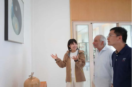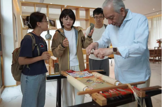 在薛憶的陪同下,Kamaljit Bawa院士一行參觀了“千鶴絲語”蠶桑文化展示中心及蠶桑生產(chǎn)基地。在楊家繡坊,薛憶重點介紹了國家級非物質(zhì)文化遺產(chǎn)——蜀繡,講解其以細膩針法、自然寫意、色彩層次豐富著稱的獨特藝術(shù)價值。Bawa院士對蜀繡的精湛刺繡技藝表示由衷贊嘆,認為其不僅展現(xiàn)了中國傳統(tǒng)工藝的高度,也體現(xiàn)了自然與文化深度融合的美學(xué)追求。