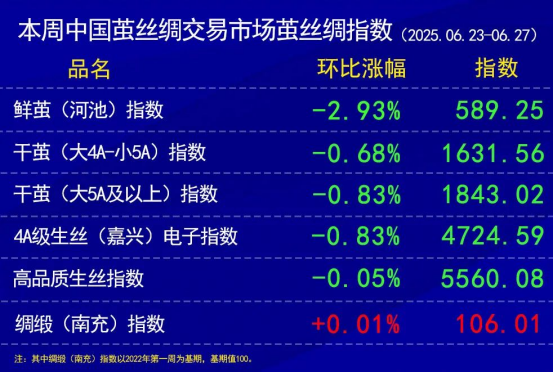 本周,高品質(zhì)生絲市場呈現(xiàn)“價(jià)穩(wěn)量縮”的態(tài)勢。高品質(zhì)生絲價(jià)格維持穩(wěn)定,但協(xié)作單位上報(bào)走貨量較前期減少,采購商多采取按需采購策略。經(jīng)指數(shù)模型計(jì)算,高品質(zhì)生絲價(jià)格指數(shù)基本持穩(wěn),略有收綠。