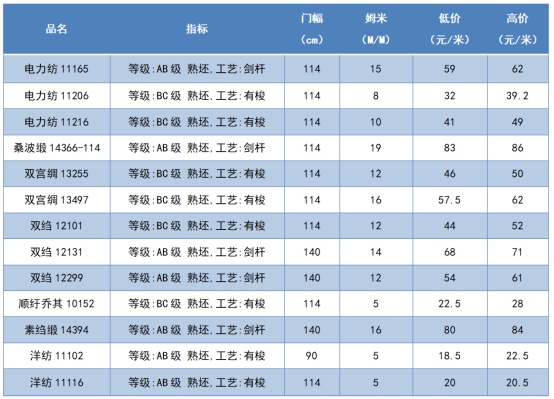 本周綢緞指數(shù)協(xié)作單位成交價(jià)格區(qū)間