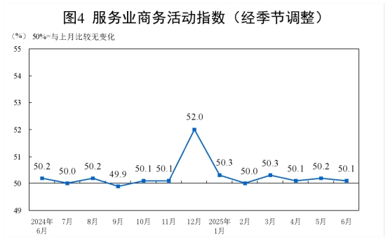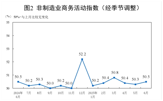 6月份,非制造業(yè)商務(wù)活動指數(shù)為50.5%,比上月上升0.2個百分點,非制造業(yè)總體繼續(xù)保持擴張。