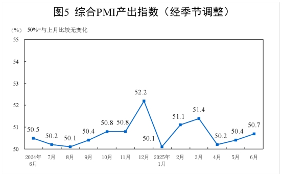6月份,綜合PMI產(chǎn)出指數(shù)為50.7%,比上月上升0.3個百分點,表明我國企業(yè)生產(chǎn)經(jīng)營活動總體擴張有所加快。