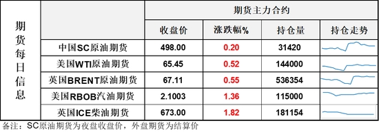 【1】WTI主力原油期貨收漲0.34美元,漲幅0.52%,報65.45美元/桶;布倫特主力原油期貨收漲0.37美元,漲幅0.55%,報67.11美元/桶;INE原油期貨收漲0.2%,報498元。