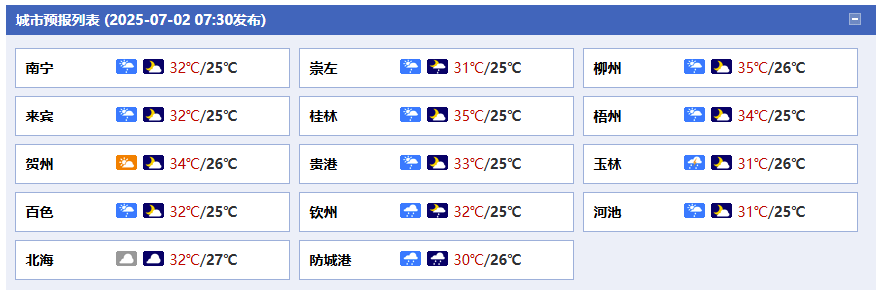 南寧市:今天白天多云有陣雨或雷雨、局地中雨或大雨,今天晚上多云,東南風(fēng)2級,最高氣溫32℃,最低氣溫25℃。