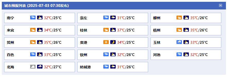 今天白天到晚上,防城港、欽州、北海、崇左、南寧、百色等市陰天有小雨、局地大雨或暴雨并伴有短時(shí)雷暴大風(fēng)等強(qiáng)對(duì)流天氣,其它地區(qū)多云有陣雨或雷雨、局地大雨。桂東部分地區(qū)最高氣溫34~36℃。
