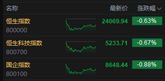 7月3日消息,港股三大指數(shù)高開低走。截至收盤,恒生指數(shù)(24069.939, -151.47, -0.63%)跌0.63%,報(bào)24069.94點(diǎn),恒生科技指數(shù)(5233.71, -35.40, -0.67%)跌0.67%,國企指數(shù)跌0.88%。盤面上,科網(wǎng)股普跌,小米集團(tuán)跌超3%,阿里巴巴、美團(tuán)、京東集團(tuán)跌超2%,聯(lián)想集團(tuán)(9.73, 0.29, 3.07%)漲超3%;創(chuàng)新藥概念大漲,華昊中天醫(yī)藥超55%;證券及經(jīng)紀(jì)板塊多股上漲,國泰君安國際(3.86, 0.40, 11.56%)漲超10%;蘋果概念股普漲,高偉電子(29.15, 1.15, 4.11%)漲超4%;鋼鐵板塊回調(diào),重慶鋼鐵股份(1.32, -0.40, -23.26%)跌超20%;新股撥康視云首日破發(fā),跌超38%。