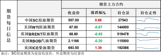 【1】WTI主力原油(607, -8.60, -1.40%)期貨收跌0.45美元,跌幅0.67%,報67美元/桶;布倫特主力原油期貨收跌0.31美元,跌幅0.45%,報68.8美元/桶;INE原油期貨收漲0.66%,報507元。