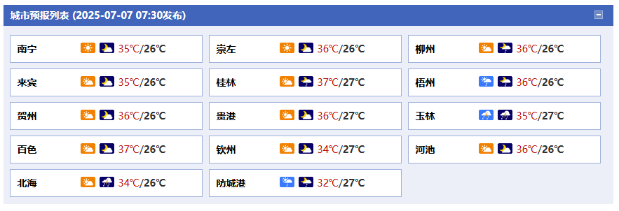 今天白天到晚上,欽州、防城港、北海等市有中雨、局地大雨或暴雨并伴有短時雷暴大風等強對流天氣,其它地區(qū)多云有陣雨或雷雨、局地大雨。全區(qū)大部地區(qū)最高氣溫34~36℃、局地37℃以上。