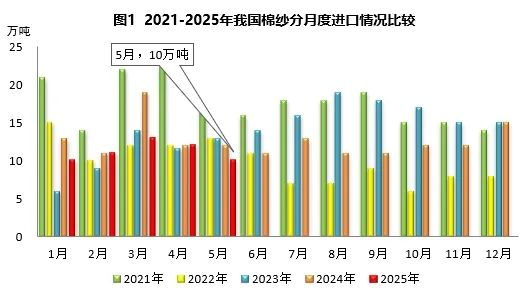 據(jù)海關(guān)統(tǒng)計(jì)數(shù)據(jù),5月我國棉紗進(jìn)口量為10萬噸,同比減少約2萬噸,減幅為14.5%;環(huán)比減少約2萬噸,減幅約為16.67%。1-5月份,我國累計(jì)進(jìn)口棉紗56萬噸,同比減少15.8%。2024/25年度(2024.9-2025.5),我國累計(jì)進(jìn)口棉紗約106萬噸,同比減少19.70%。