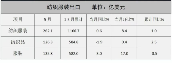 據(jù)海關(guān)總署數(shù)據(jù),5月,我國紡織服裝出口額262.1億美元,同比增長0.6%,環(huán)比增長8.4%。其中紡織品出口額126.3億美元,同比下降1.9%,環(huán)比增長0.4%;服裝出口額135.8億美元,同比增長3%,環(huán)比增長17%。1-5月,我國紡織服裝累計(jì)出口額1166.7億美元,同比增長1.0%。其中紡織品出口額584.8億美元,同比增長2.5%;服裝出口額582億美元,同比下降0.5%。
