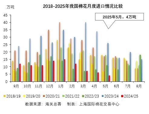 據(jù)海關(guān)統(tǒng)計(jì)數(shù)據(jù),5月我國棉花進(jìn)口量為4萬噸,環(huán)比(6萬噸)減少2萬噸,減幅為33.9%;同比(26萬噸)減少22萬噸,減幅為86.3%。1-5月份,我國累計(jì)進(jìn)口棉花44萬噸,同比減少73.5%。其中,巴西棉為23.57萬噸,占進(jìn)口總量的53.8%;美棉為9.4萬噸,占進(jìn)口總量的21.36%。巴西取代美國成為我國棉花第一大供應(yīng)國。