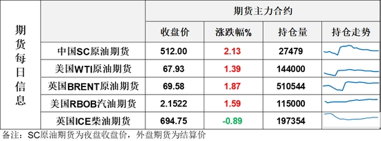 【1】WTI主力原油期貨收漲0.93美元,漲幅1.39%,報67.93美元/桶;布倫特主力原油期貨收漲1.28美元,漲幅1.87%,報69.58美元/桶;INE原油期貨收漲2.13%,報512元。