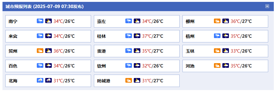 桂東、桂北部分地區(qū)最高氣溫34~36℃、局地37℃以上。