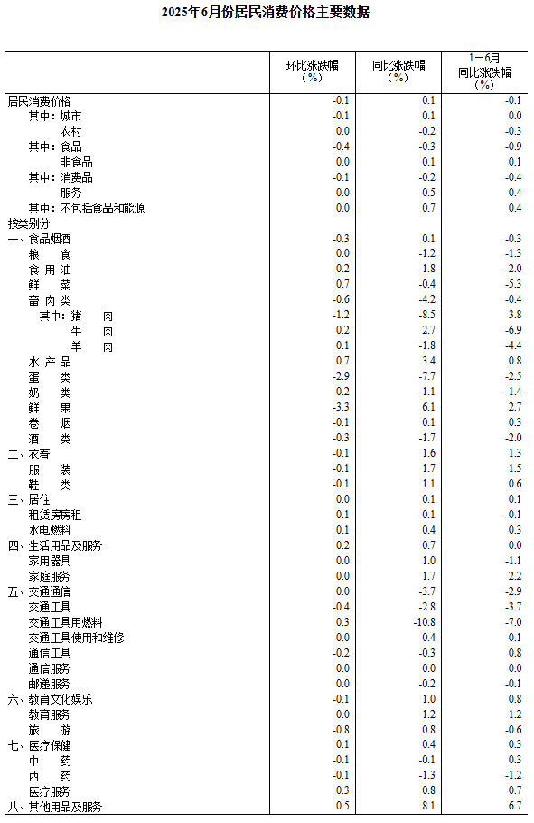 2025年6月份,全國居民消費(fèi)價(jià)格同比上漲0.1%。其中,城市上漲0.1%,農(nóng)村下降0.2%;食品價(jià)格下降0.3%,非食品價(jià)格上漲0.1%;消費(fèi)品價(jià)格下降0.2%,服務(wù)價(jià)格上漲0.5%。上半年,全國居民消費(fèi)價(jià)格比上年同期下降0.1%。