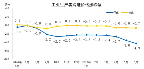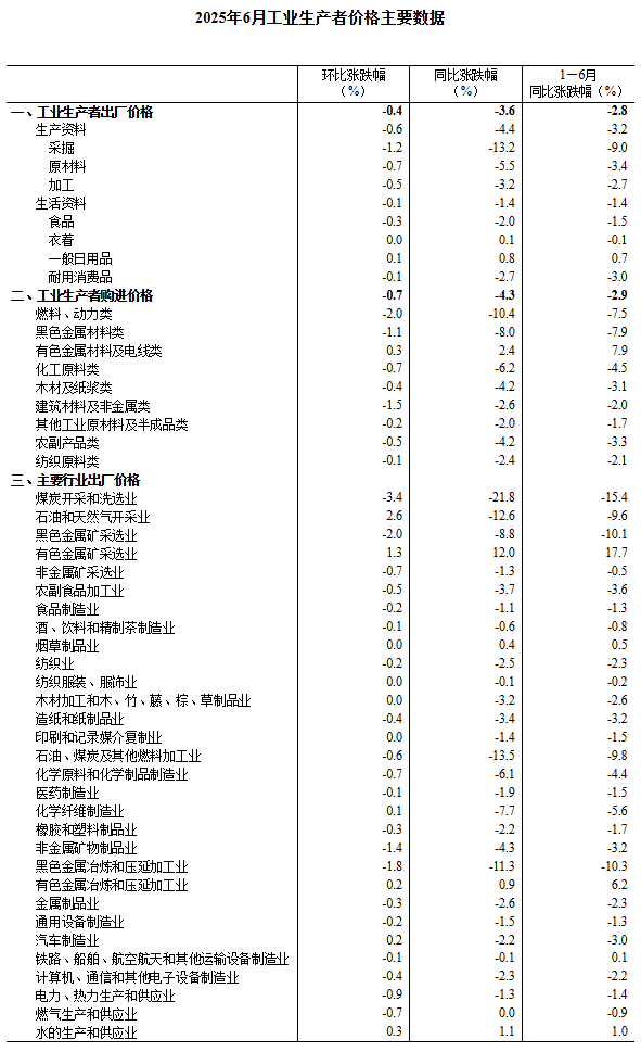 2025年6月份,全國工業(yè)生產(chǎn)者出廠價格同比下降3.6%,環(huán)比下降0.4%;工業(yè)生產(chǎn)者購進(jìn)價格同比下降4.3%,環(huán)比下降0.7%。上半年,工業(yè)生產(chǎn)者出廠價格比上年同期下降2.8%,工業(yè)生產(chǎn)者購進(jìn)價格下降2.9%。