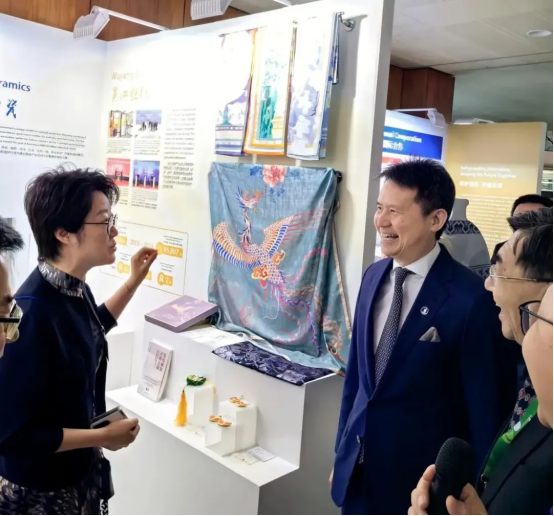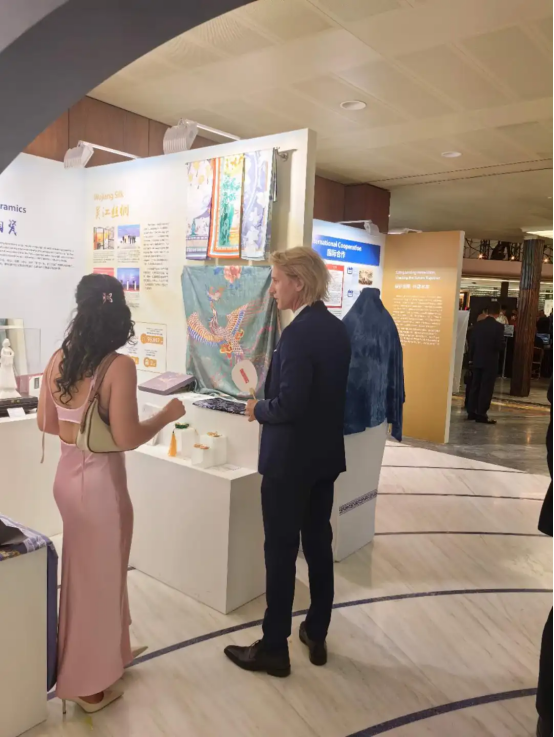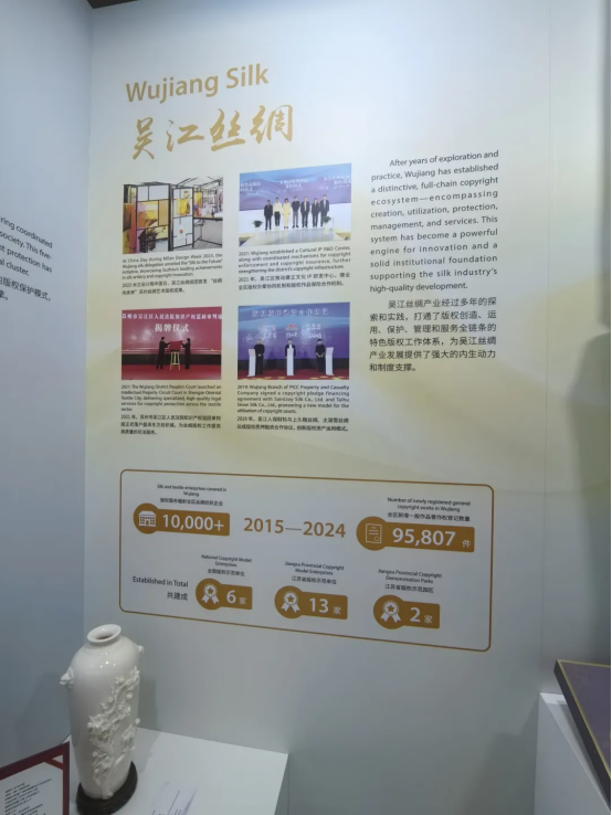本次展覽通過圖文視頻、實物展示、互動體驗、案例及表演等形式全面展現(xiàn)中國版權(quán)事業(yè)的發(fā)展歷程與國際合作。吳江絲綢版權(quán)保護成果作為蘇州的主展陳之一,吸引了眾多國際嘉賓的目光。
