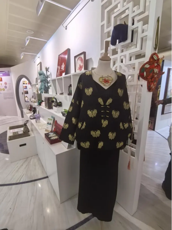 展覽現(xiàn)場,來自上久楷的“黑金蝴蝶綠寶石”宋錦套裝搭配龍泉禧禮的“如愿”盤扣項圈,以其獨特的設(shè)計和高超的工藝贏得了現(xiàn)場觀眾的一致好評。兩件作品相得益彰不僅展示了吳江絲綢的精湛技藝,也傳遞了中國傳統(tǒng)文化的深厚底蘊。