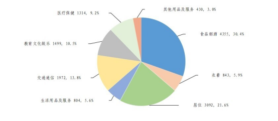 上半年,全國居民人均食品煙酒消費支出4355元,增長3.3%,占人均消費支出的比重為30.4%;人均衣著消費支出843元,增長2.1%,占人均消費支出的比重為5.9%;人均居住消費支出3092元,增長2.9%,占人均消費支出的比重為21.6%;人均生活用品及服務消費支出804元,增長9.0%,占人均消費支出的比重為5.6%;人均交通通信消費支出1972元,增長8.4%,占人均消費支出的比重為13.8%;人均教育文化娛樂消費支出1499元,增長11.8%,占人均消費支出的比重為10.5%;人均醫(yī)療保健消費支出1314元,增長3.4%,占人均消費支出的比重為9.2%;人均其他用品及服務消費支出430元,增長10.4%,占人均消費支出的比重為3.0%。