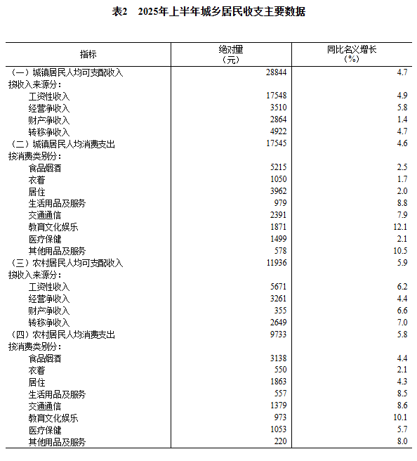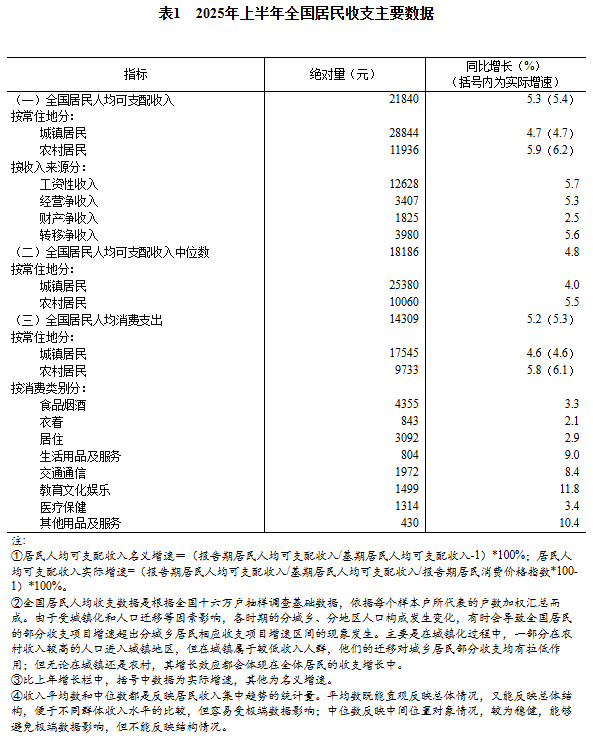 上半年,全國居民人均可支配收入21840元,比上年同期名義增長5.3%,扣除價格因素,實際增長5.4%。分城鄉(xiāng)看,城鎮(zhèn)居民人均可支配收入28844元,增長(以下如無特別說明,均為同比名義增長)4.7%,扣除價格因素,實際增長4.7%;農(nóng)村居民人均可支配收入11936元,增長5.9%,扣除價格因素,實際增長6.2%。