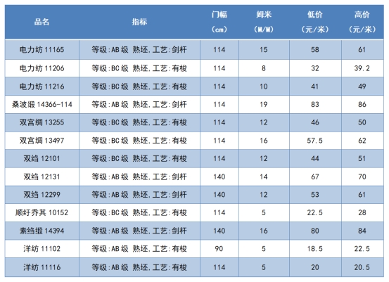 本周綢緞指數(shù)協(xié)作單位成交價(jià)格區(qū)間