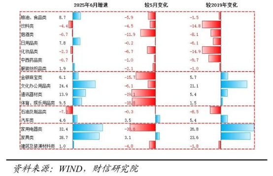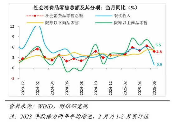 上半年社會消費(fèi)品零售總額同比增長5.0%,較去年全年提高1.5個百分點,總體保持較好恢復(fù)態(tài)勢。但6月當(dāng)月社零同比增長4.8%,在去年基數(shù)大幅走低的基礎(chǔ)上(2024年6月社零增速較上月回落1.7個百分點至2.0%),仍較上月回落1.6個百分點;環(huán)比增長-0.16%,創(chuàng)歷史同期最差表現(xiàn),消費(fèi)邊際放緩較多。