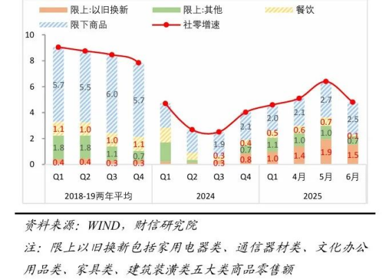 往后看,預(yù)計下半年社零增速或繼續(xù)放緩。一是受高基數(shù)和乘數(shù)效用邊際趨弱的拖累,下半年以舊換新政策的拉動作用大概率減弱。二是隨著內(nèi)外需放緩壓力加大,居民就業(yè)或明顯承壓,“就業(yè)-收入-消費(fèi)”循環(huán)待暢通,將制約消費(fèi)能力改善空間。