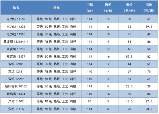 本周綢緞指數(shù)協(xié)作單位成交價格區(qū)間