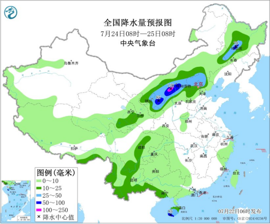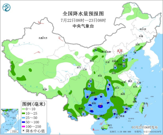 圖3 全國(guó)降水量預(yù)報(bào)圖(7月22日08時(shí)-23日08時(shí))