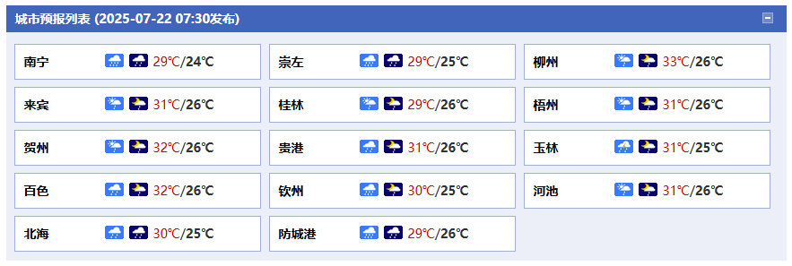 今天晚上,欽州、防城港、崇左、百色等市有中到大雨、局地暴雨,其它地區(qū)有小到中雨、局地暴雨。