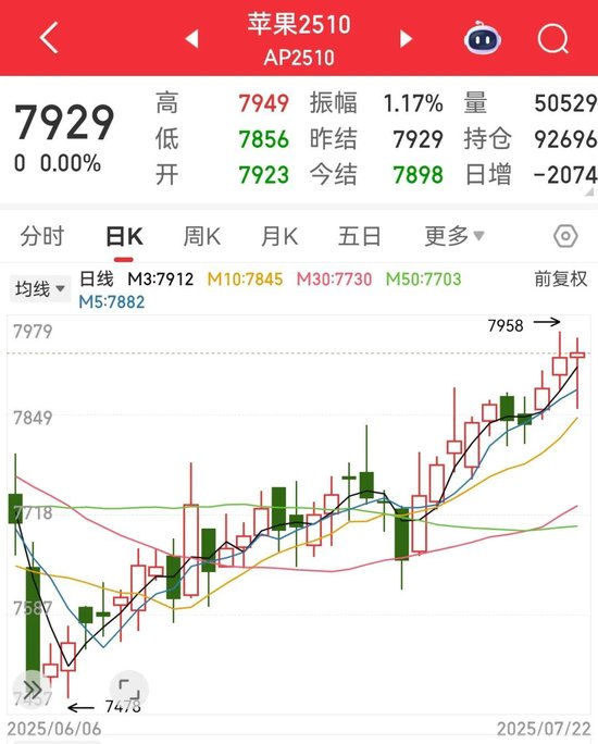 6月中旬以來,蘋果(6987, 33.00, 0.47%)期貨價格持續(xù)上漲引發(fā)市場關(guān)注。截至昨日收盤,蘋果期貨主力合約2510報7929元/噸,延續(xù)漲勢。