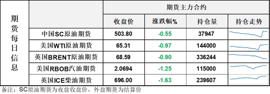 【1】WTI主力原油期貨收跌0.64美元,跌幅0.97%,報65.31美元/桶;布倫特主力原油期貨收跌0.62美元,跌幅0.9%,報68.59美元/桶;INE原油期貨收跌0.55%,報503.8元。