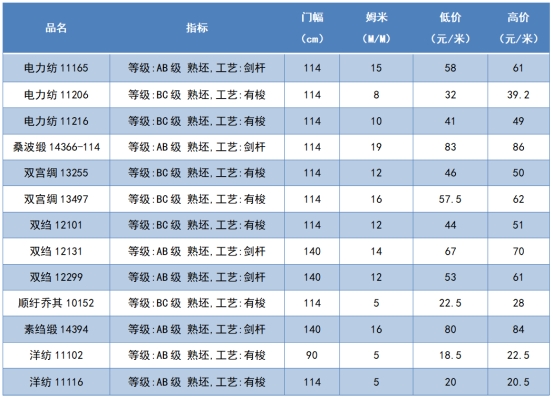 本周綢緞指數(shù)協(xié)作單位成交價(jià)格區(qū)間
