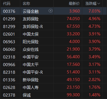 保險股普漲,友邦保險漲近5%。7月25日,保險行業(yè)協(xié)會組織召開人身保險業(yè)責任準備金評估利率專家咨詢委員會2025年二季度例會,研究認為當前普通型人身保險產(chǎn)品預定利率研究值為1.99%。中信證券(29.05, 0.10, 0.34%)發(fā)布研報指頭部保險公司健康擴表,保險行業(yè)步入向上周期。