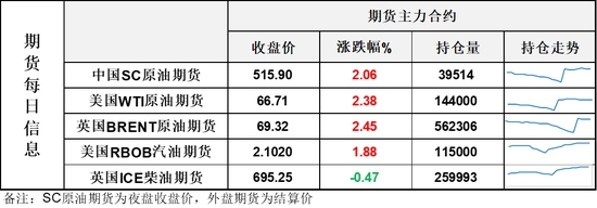 【1】WTI主力原油期貨收漲1.55美元,漲幅2.38%,報66.71美元/桶;布倫特主力原油期貨收漲1.66美元,漲幅2.45%,報69.32美元/桶;INE原油期貨收漲2.06%,報515.9元。