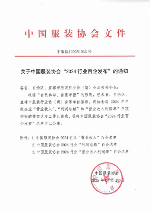 2025年7月23日,中國服裝協(xié)會“2024行業(yè)百企發(fā)布”名單正式揭曉。