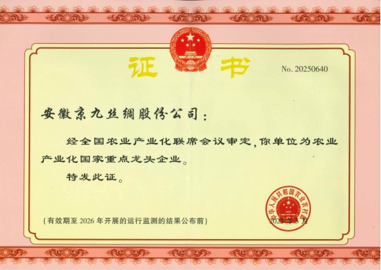 近日,經(jīng)全國農(nóng)業(yè)產(chǎn)業(yè)化聯(lián)席會(huì)議審定,安徽京九絲綢股份公司憑借突出的產(chǎn)業(yè)實(shí)力、卓越的創(chuàng)新能力和強(qiáng)大的聯(lián)農(nóng)帶農(nóng)效應(yīng),再次被評定為“農(nóng)業(yè)產(chǎn)業(yè)化國家重點(diǎn)龍頭企業(yè)”。這一結(jié)果不僅是對企業(yè)持續(xù)領(lǐng)跑行業(yè)的權(quán)威認(rèn)證,更標(biāo)志著公司作為國家級絲綢產(chǎn)業(yè)標(biāo)桿的綜合實(shí)力與社會(huì)貢獻(xiàn)獲得國家層面的高度認(rèn)可。