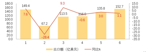 1-6月我國(guó)對(duì)“一帶一路”共建國(guó)家出口313.4億美元,同比下降3.9%,占比42.7%。對(duì)東盟出口66.3億美元,下降15.9%,占比9%。對(duì)中亞五國(guó)出口46.5億美元,大幅下降26.3%。對(duì)韓國(guó)出口32億美元,增長(zhǎng)6.6%。對(duì)俄羅斯出口16.8億美元,下降1.6%。對(duì)拉丁美洲出口48.7億美元,增長(zhǎng)13.8%。對(duì)非洲出口42.6億美元,增長(zhǎng)12.3%。對(duì)海合會(huì)六國(guó)出口21.2億美元,下降5.6%。