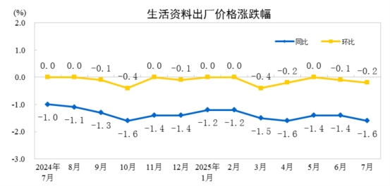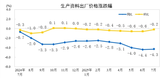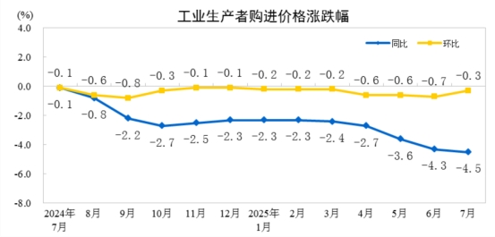 2025年7月份,全國工業(yè)生產(chǎn)者出廠價(jià)格環(huán)比下降0.2%,工業(yè)生產(chǎn)者購進(jìn)價(jià)格環(huán)比下降0.3%,降幅比上月分別收窄0.2個(gè)和0.4個(gè)百分點(diǎn)。工業(yè)生產(chǎn)者出廠價(jià)格同比下降3.6%,工業(yè)生產(chǎn)者購進(jìn)價(jià)格同比下降4.5%。1—7月平均,工業(yè)生產(chǎn)者出廠價(jià)格比上年同期下降2.9%,工業(yè)生產(chǎn)者購進(jìn)價(jià)格下降3.2%。