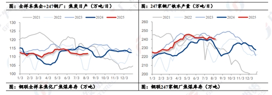 需求方面,下游焦化企業(yè)開工逐步提升,焦炭(2232, -47.00, -2.06%)連續(xù)提漲焦化利潤修復(fù),疊加下游鋼廠補庫需求較好,開工有進(jìn)一步提升可能;鋼廠近期由于鋼價上漲,普遍盈利較好,鐵水保持高位,目前247家樣本鋼廠鐵水產(chǎn)量仍處于240萬噸/日水平,給予原料需求支撐。
